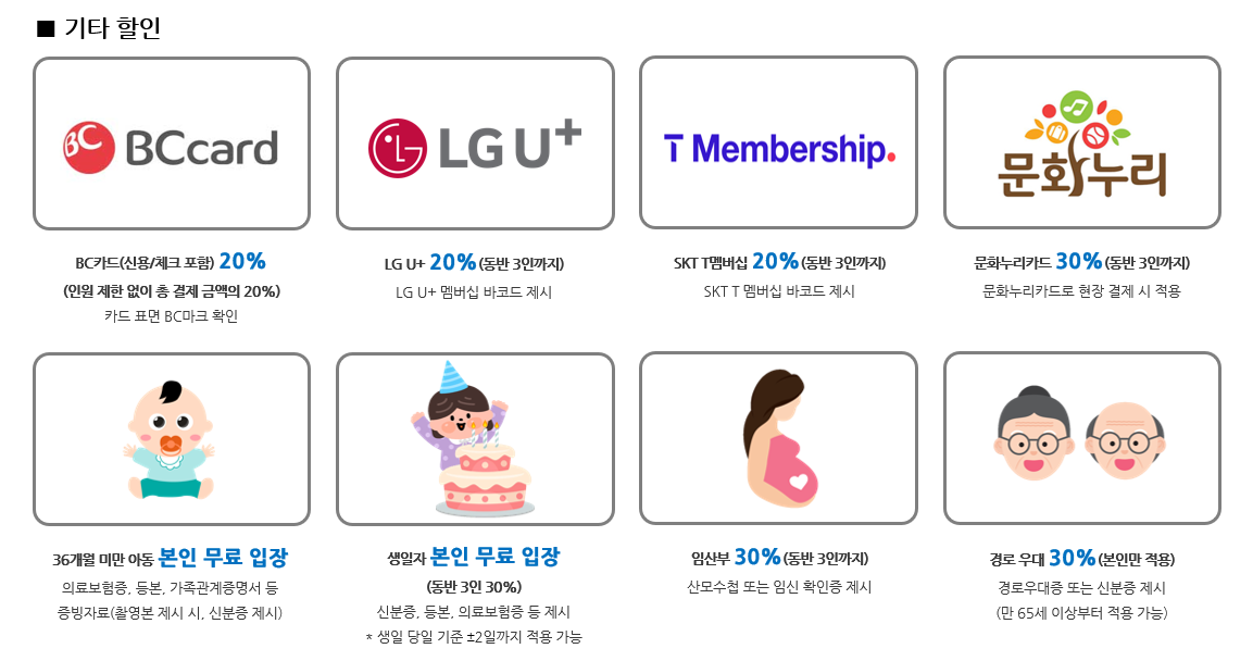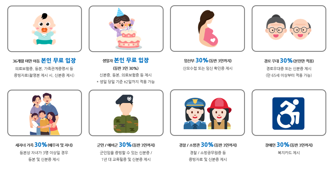 * 본 할인 혜택은 일일 입장권 기준 입니다. (기간권은 할인 X)